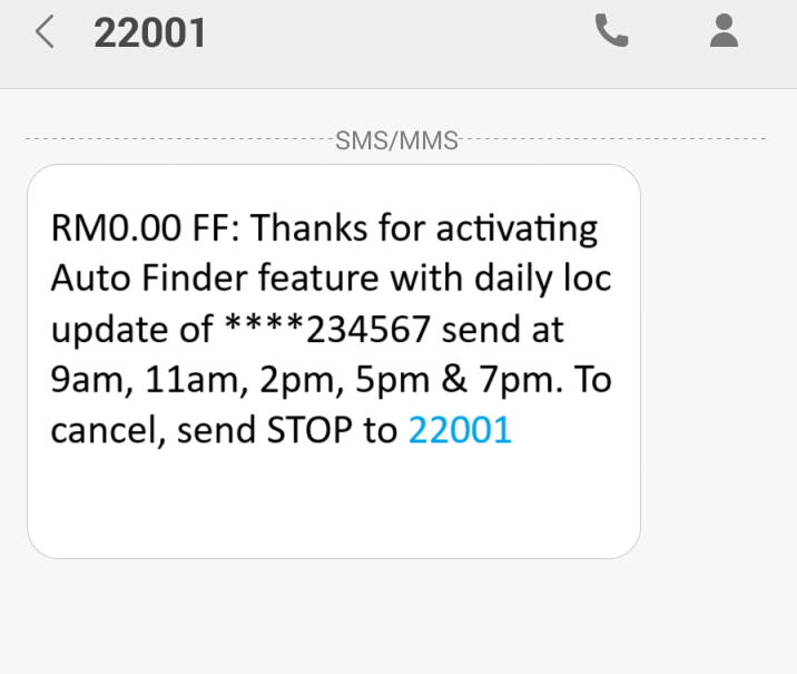RM0.00 FF: Thanks for activating Auto Finder feature with daily loc update of ****234567 send at 9am, 11am, 2pm, 5pm & 7pm. To cancel, send STOP to 22001