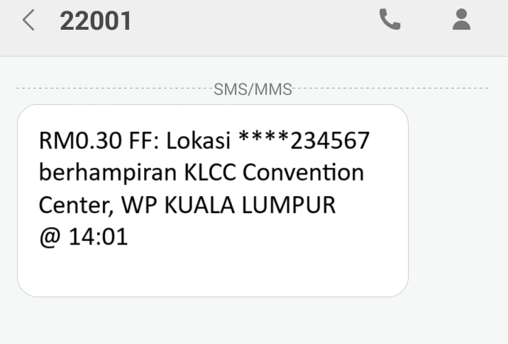 v) RM0.30 FF: Lokasi ****234567 berhampiran KLCC Convention Center, WP KUALA LUMPUR @ 19:01