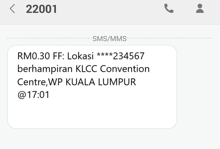 iv) RM0.30 FF: Lokasi ****234567 berhampiran KLCC Convention Center, WP KUALA LUMPUR @ 17:01